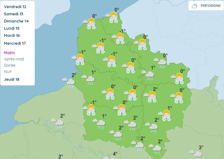 Le ciel alternera entre les éclaircies et les passages plus couverts, avec de la neige annoncée mercredi prochain dans une grande partie des Hauts-de-France. Le site de prévision européen Ventusky prévoit même de la neige pendant plusieurs jours, entre jeudi et samedi prochain.