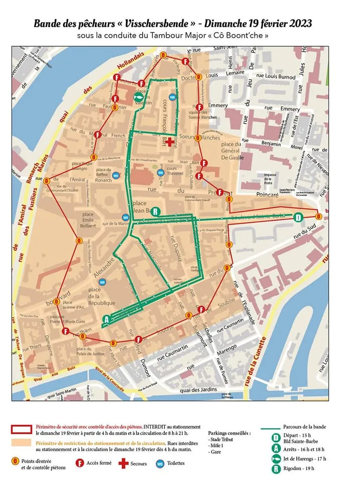 Le départ se fait à 15 heures, depuis le boulevard Sainte Barbe. Lancer de harents à 17 heures sous les balcons de l'hôtel de ville, suivi du Rigodon final, autour de la statue de Jean Bart, à qui les carnavaleux rendent hommage, à 19 heures. Le tout sous la conduite du Tambour Major "Cô Boont'che". Cela sera suivi par le bal des acharnés à la salle du Kursaal pour les plus courageux !