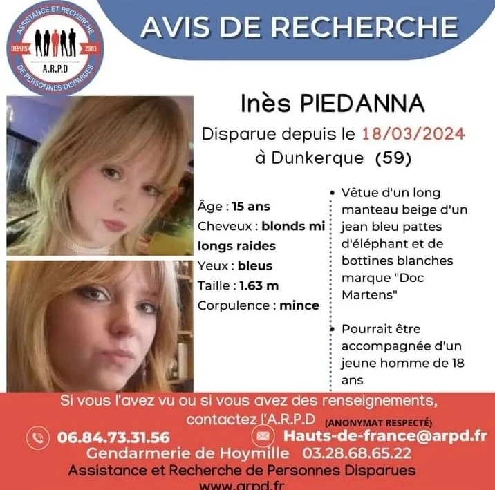 A Dunkerque, on est toujours sans nouvelles d’Inès Piedanna, 15 ans. La jeune fille a les cheveux blonds, mi longs et raides, les yeux bleus et mesure 1m63. Elle est introuvable depuis le 18 mars, date à laquelle elle a quitté volontairement le lycée. Elle portait un jean pattes d’éléphant bleu, des bottines blanches, et un long manteau beige. La jeune fille pourrait être accompagnée d’un garçon de 18 ans. Toute personne l’ayant aperçue ou ayant des informations à son sujet est priée de contacter la gendarmerie de Hoymille au