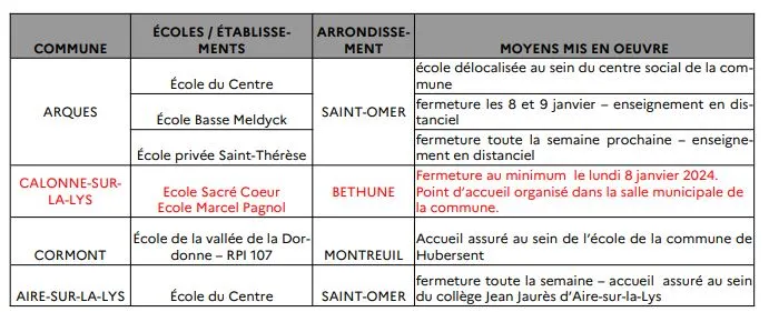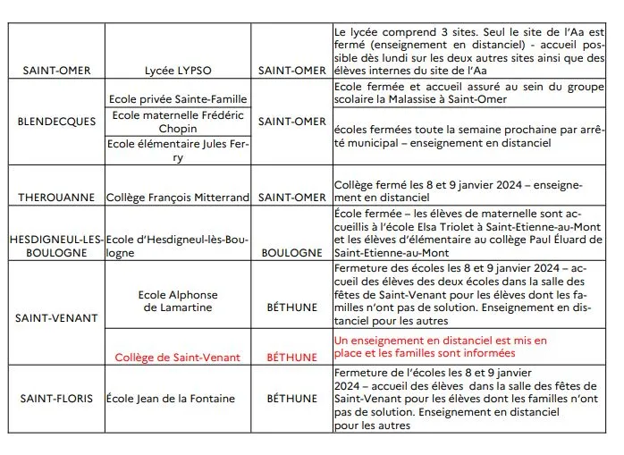Les enfants font leur rentrée, ce lundi, après les vacances de noël. 16 écoles et collèges restent néanmoins fermées dans le pas de calais, après les inondations de la semaine dernière. C’est le cas de certains écoliers d’Arques, Calonne sur la Lys, de Cormont, Aire sur la Lys, Saint Venant, Saint Omer, Blendecques, Thérouanne, ou le collège est fermé toute la semaine. Des écoles sont aussi fermées à Hesdigneul les Boulogne, et Saint Floris. Certains écoliers seront accueillis dans d’autres établissements scolaires. L’enseignement se fera à distance pour d’autres.