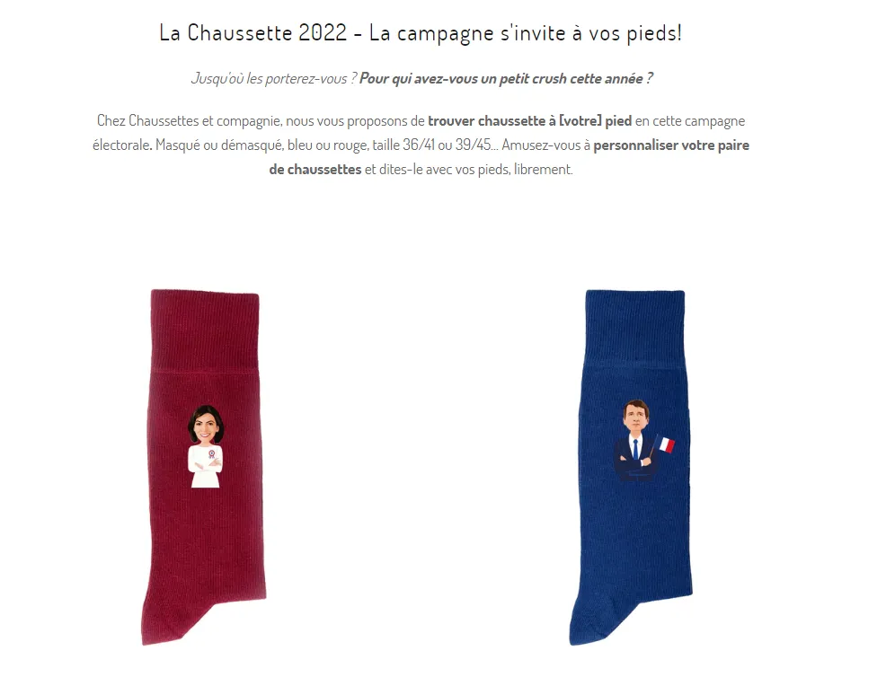 La boutique « Chaussettes et Compagnie », à Lille, a récemment lancé une collection de chaussettes pour l'élection présidentielle. Pour 13 € la paire, il est possible d’afficher à vos chevilles les portraits de sept candidats.