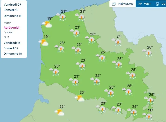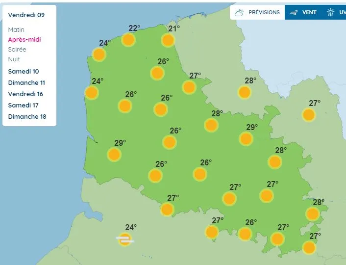 Le pic de chaleur est attendu vendredi et samedi. Comptez entre 21 et 25 °C sur le littoral et de 26 à 29 °C en moyenne dans l’intérieur des terres. Les maximales iront jusqu’à 30 °C à Norrent-Fontes, Hazebrouck, Lens et Béthune. La barre des 30 °C seront même dépassés un peu partout samedi. Attention, les indices UV seront importants (7 à 8). Si vous avez prévu d’installer les transats, n’oubliez pas la crème solaire !